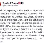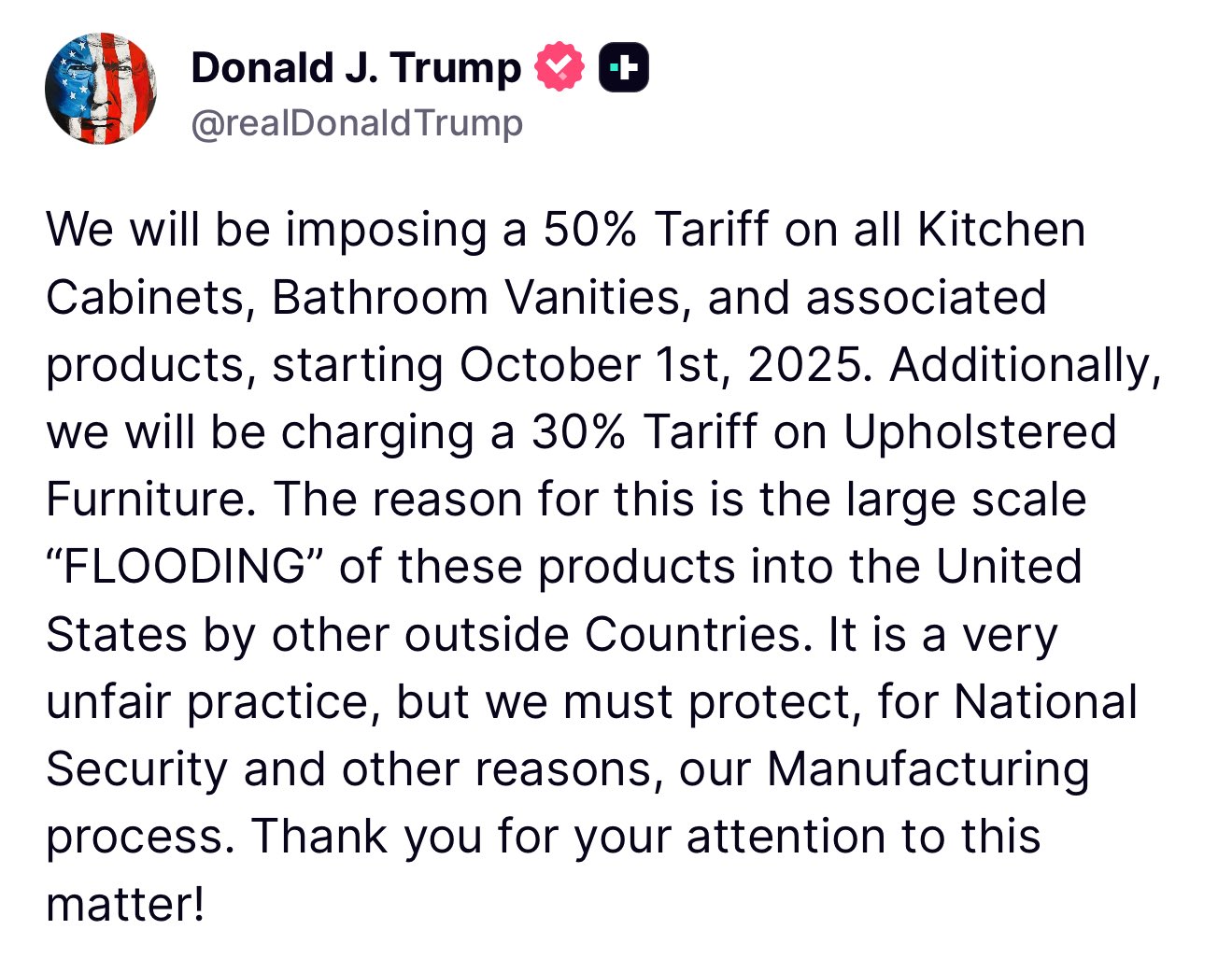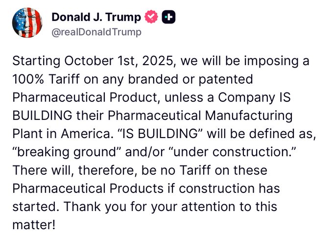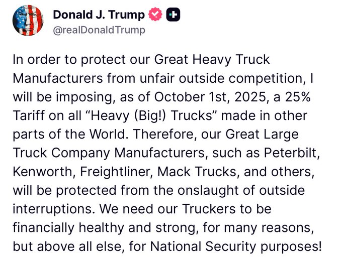 Hoy mismo, el presidente Trump ha hecho varias declaraciones sobre la Verdad Social anunciando nuevos aranceles que entrarán en vigor el 1 de octubre de 2025.