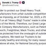 Camiones pesados: Un arancel del 25% sobre todos los Camiones Pesados (Grandes) importados fabricados fuera de Estados Unidos.